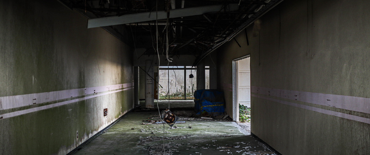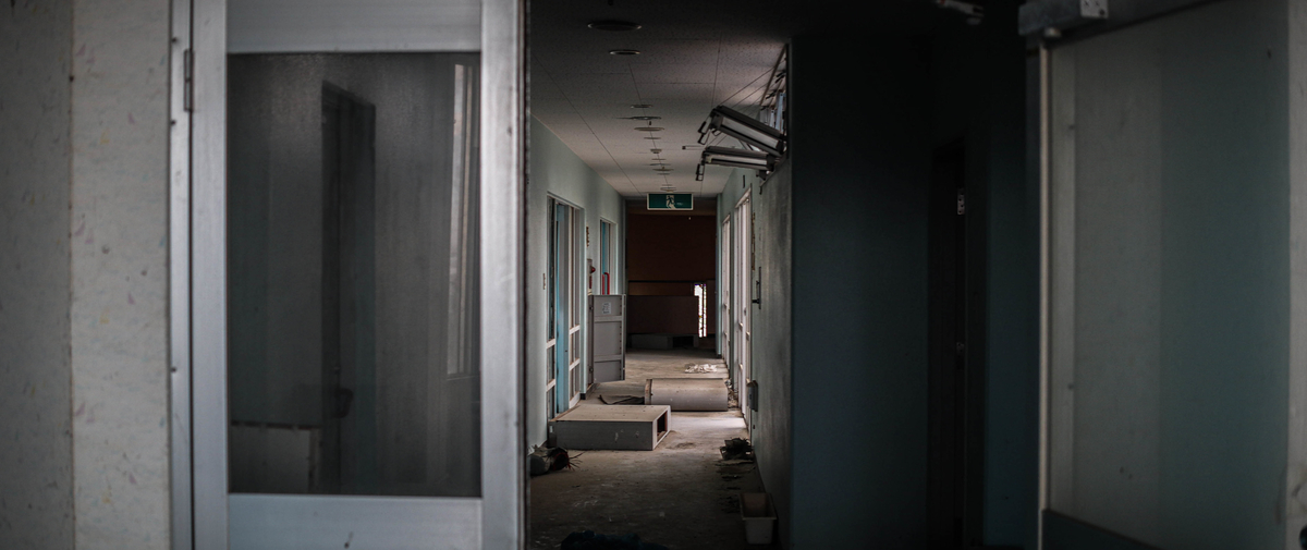 道路から病院を見た時驚いた。普通に車が止まってて特に閉鎖されてる雰囲気もない。でも次の瞬間、駐車場の色んな場所から生えている草を見て目が覚めた。考えてみたら当たり前のことだが。よく見たら車は苔むしておりタイヤの空気は空っぽ。年式も10年以上前の車ばかり。